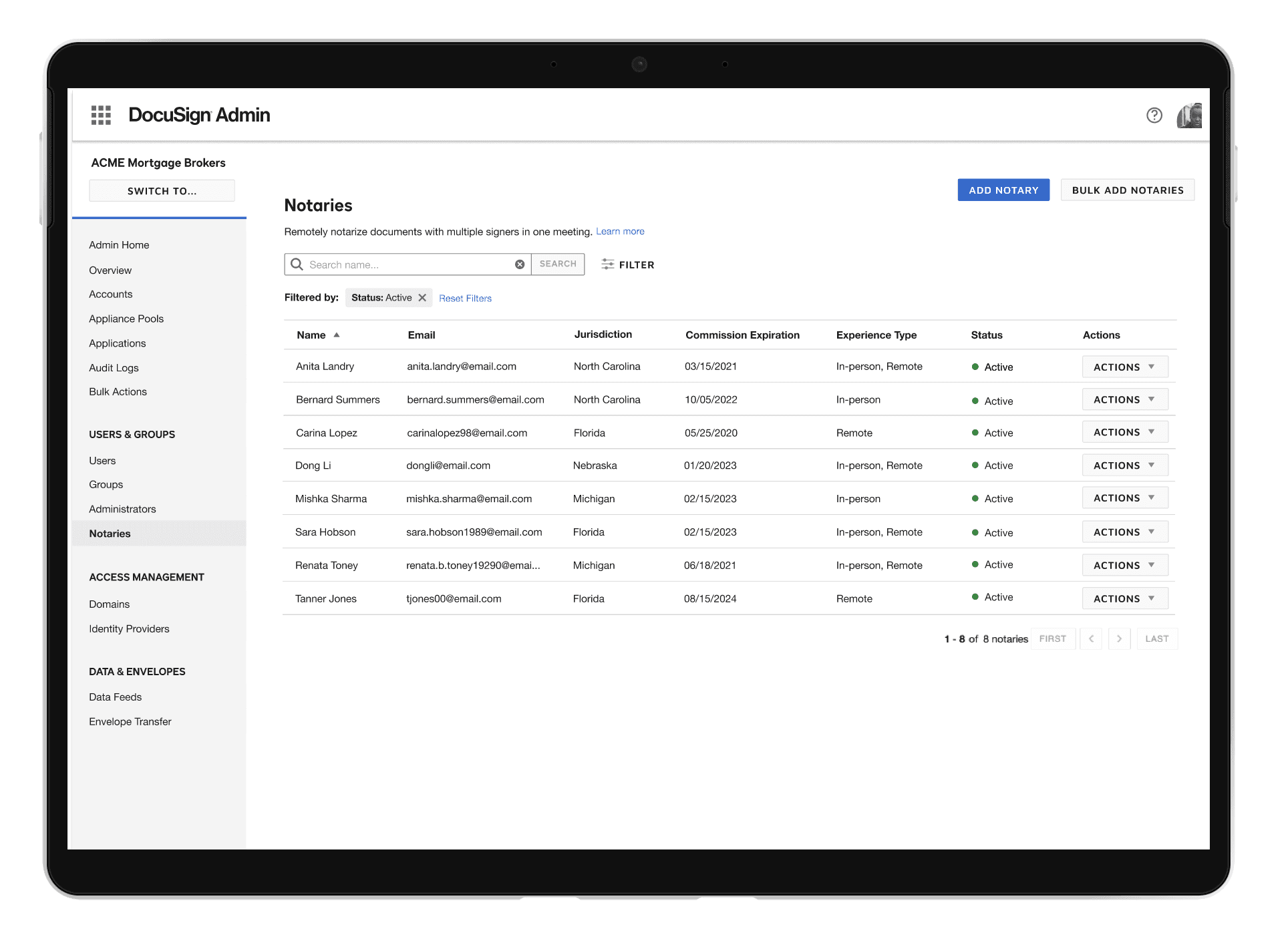 Admin screen for organizations to view and manage their registered notaries. Admins can see which experience type(s) their notaries are commissioned for: RON, IPEN, or both.