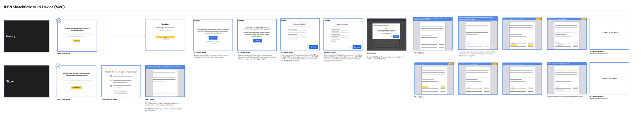 Based on the user interviews and collaboration with our research team, I landed on a multi-device approach for the MVP design phase. Notary and signer join session via secure email link. Notary confirms the signer is present, verifies their identity, and fills out required session information while signer can preview the document. Then the document can be signed and notarized.