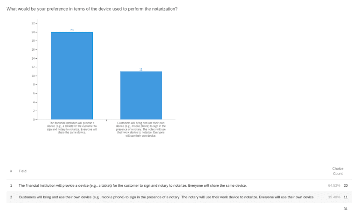 Our research team interviewed 31 notaries and 47 signers to get an idea of their priorities surrounding the notarization experience, specifically regarding device usage. Do notaries prefer signers to bring their own devices to sign on, or do they prefer their organization to provide a device for the signer and notary to share for the session? And do signers prefer to be provided a device, or bring their own?